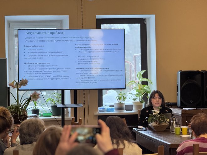 В докладе был обоснован переход от традиционного понимания городского двора как изолированной зоны благоустройства к его рассмотрению в качестве многофункционального элемента зелёного каркаса мегаполиса.